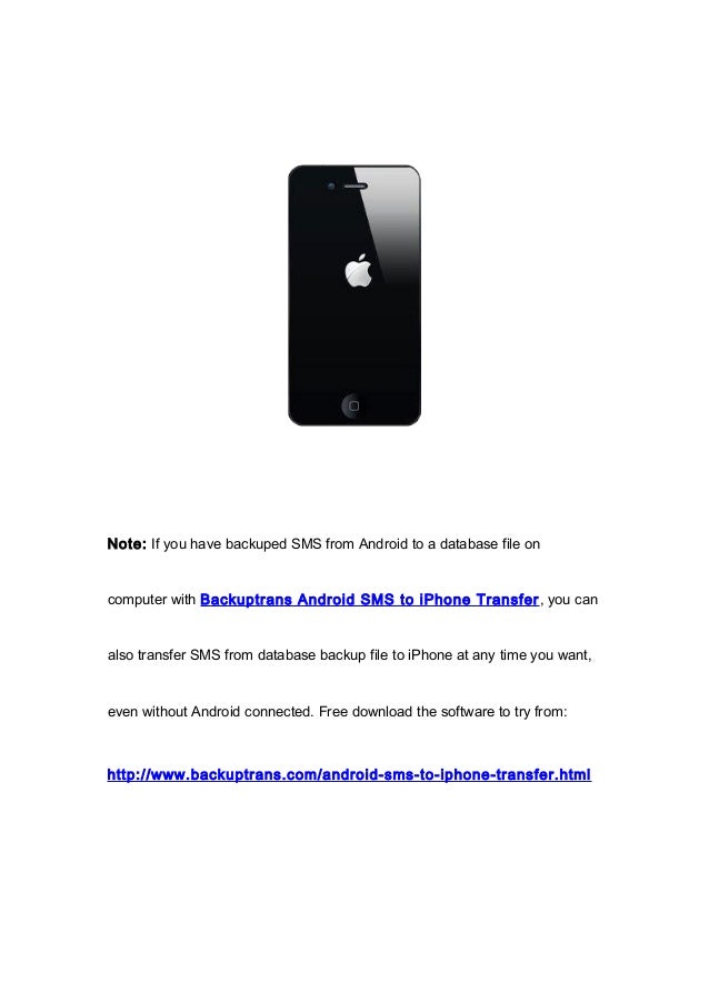 Backuptrans Android iPhone SMS Transfer Plus 2.14.33 15.6 Mb Whether you're looking to manage SMS for both your Android and iPhone device or to transfer SMS between Android and iPhone, Backuptrans Android iPhone SMS Transfer + is the best all-in-one SMS manager package for Android and iPhone. It lets you transfer SMS on computer with ease. Now it is fully compatible with the latest iOS 10 and iPhone 7/iPhone 7 Plus. Transfer SMS between Android and iPhone Save SMS from Android/iPhone onto local database on computer Restore SMS from local database to Android/iPhone. Copy SMS from iTunes backup to Android/iPhone Transfer SMS between two Android phones, transfer SMS between two iPhones Export SMS to document files such as txt, csv, doc or html Print SMS messages in conversations iMessage supported also Windows NT/2000/XP/2003/Vista/7/8/10 - DOWNLOAD uploadgig.